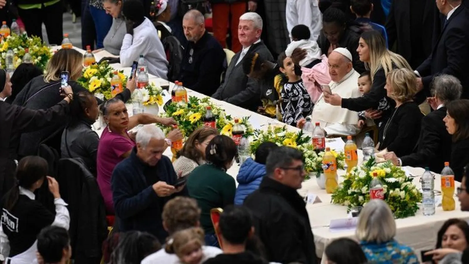 Las mesas decoradas con flores blancas y amarillas, sirvieron de escenario para fotografías y selfis que inmortalizaron un momento inolvidable de acogida, atención, cuidado y amor hacia todos aquellos que durante el resto del año viven en las calles, en la indiferencia de la ciudad y quien hoy compartieron la mesa con el Pontífice.