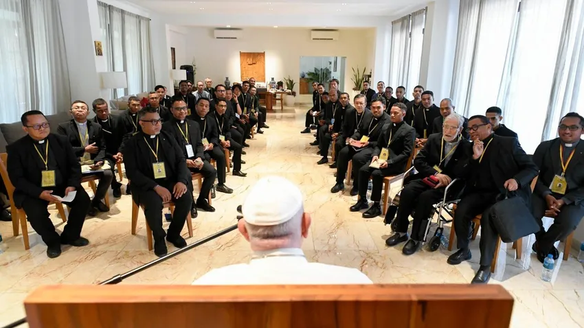 Hoy, 10 de septiembre, ha tenido lugar el segundo encuentro del Papa Francisco con los jesuitas, tras el encuentro de cerca de una hora del pasado 4 de septiembre en Yakarta con 200 cohermanos. Le espera otro el jueves 12 de septiembre en el Centro de Retiros San Francisco Javier de Singapur. Esta mañana se encontraban en la Nunciatura de la capital timorense 41 miembros de la Compañía de Jesús, procedentes también de otras regiones pero residentes y activos en Timor-Leste. Entre ellos había ocho novicios.