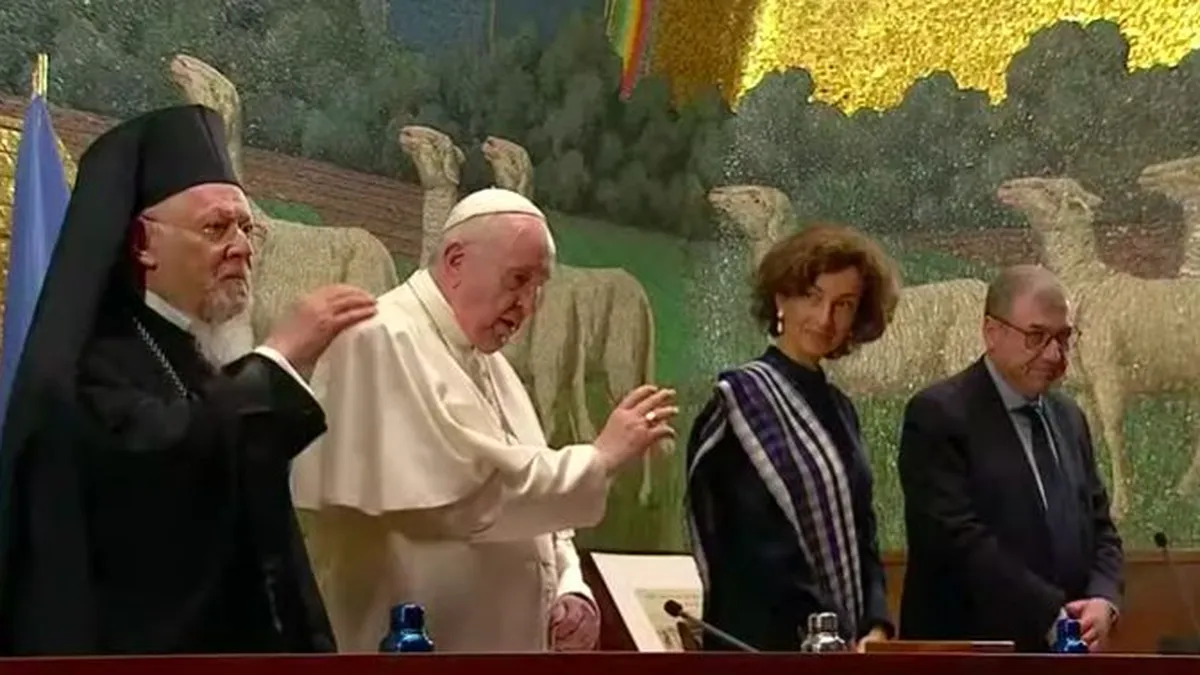 En su discurso, ante Bartolomé, la directora general de la Unesco y la comunidad académica de Letrán, Bergoglio abogó por "sentar las bases de un diálogo abierto y estructurado con todos sobre cómo conocer y escuchar la voz de nuestra casa común, que exige ser cuidada y alimentada".