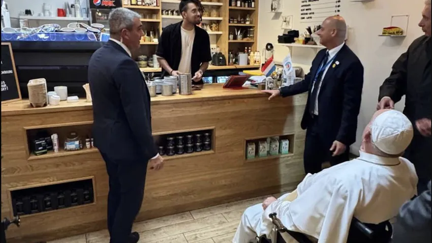 Según explicó el Vaticano, después de comer, el Papa y alguno de sus colaboradores fueron a una cafetería cercana a tomarse un café, cómo se observa en la foto que proporcionaron a los medios y en las que se ve a un sorprendido camarero.