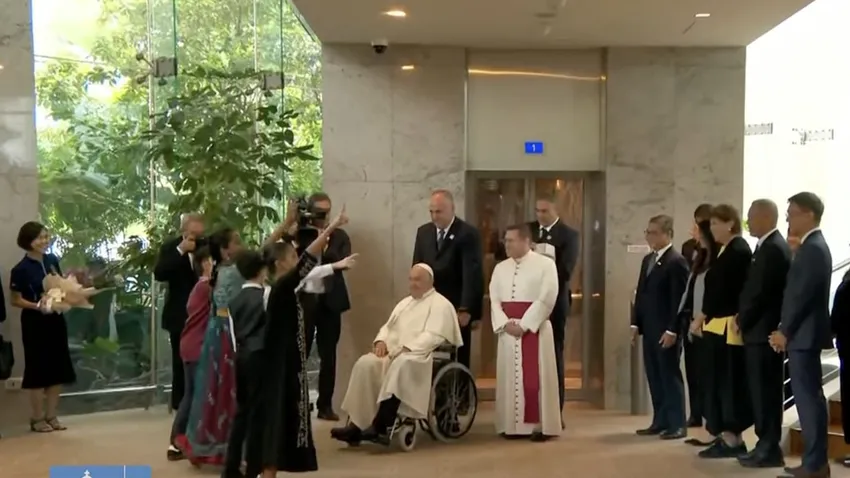 A su llegada, el Papa fue recibido por el Ministro de Cultura, Comunidad y Juventud, Edwin Tong, con su consorte, y por la Embajadora Extraordinaria y Plenipotenciaria de Singapur ante la Santa Sede, Ang Janet Guat Har. Juntos se dirigieron a la Sala Dendrobium para mantener un breve encuentro.