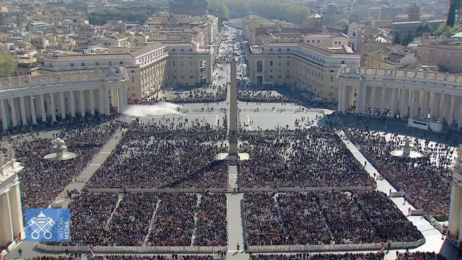 En una plaza abarrotada (mal que les pese a los falsos profetas de desventuras, había más de 50.000 personas, que también acompañaron después de la misa a Francisco en su recorrido y saludos posteriores a la misa, y antes de la bendición 'Urbi et Orbi') y vestida con sus mejores galas, se escuchó el Pregón Pascual en el que se anuncia la Resurrección de Cristo, y el Evangelio (en latín y griego) en el que se narra el descubrimiento del sepulcro vacío por parte de las mujeres, las primeras testigos del cumplimiento de la Promesa.