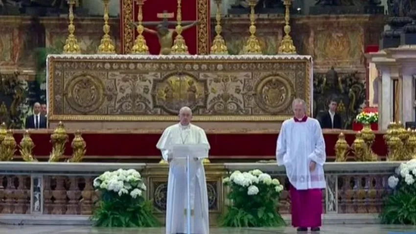 Fue una celebración atípica, en soledad, compartida con el resto de la humanidad a través de las redes sociales. Revestido de blanco, y ante un ya desvelado Cristo de la Peste, Francisco presidió la misa de la Pascua de Resurrección en una vaciada y luminosa basílica de San Pedro.