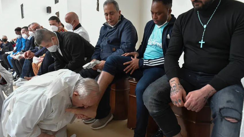 El papa Francisco regresó hoy a una prisión para celebrar con los presos la misa "In coena domini" de Jueves Santo, que conmemora la Última Cena, y se arrodilló ante ellos para lavar sus pies, animándoles a ayudarse entre sí, después de dos años en los que la pandemia había suspendido esta tradición.