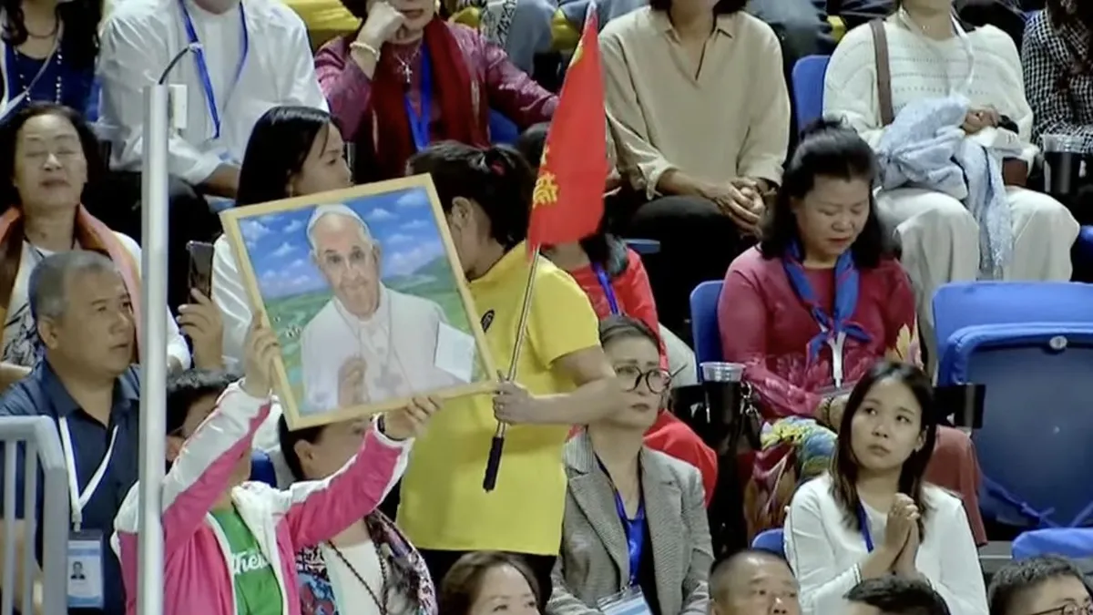 En el Estepa Arena de Ulán Bator, un grupo de unos 40 católicos de Hong Kong exhiben sus banderas y pancartas, mientras que al lado otro grupo de unos 20 llegados desde el norte de China con su párroco muestra la bandera china cuando el papa pasa delante de ellos antes de celebrar la misa.