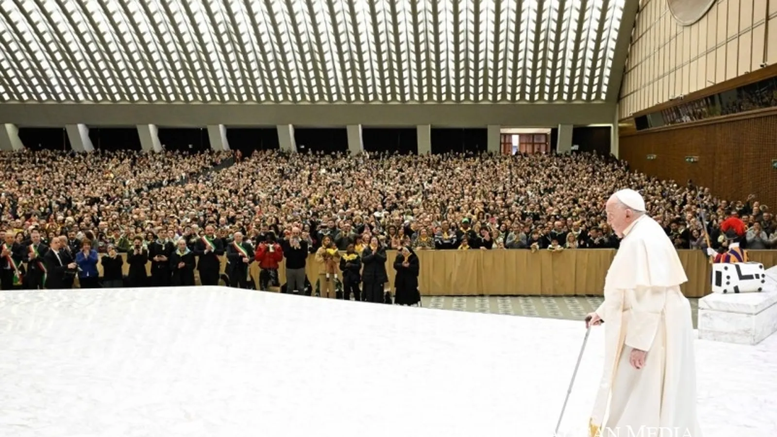 Tras ello, fue acompañado sujetándose con su asistente y con el jefe de la prefectura de la Casa Pontificia, Leonardo Sapienza, hasta que tomó asiento ante miles de asistentes en la audiencia en el Vaticano.