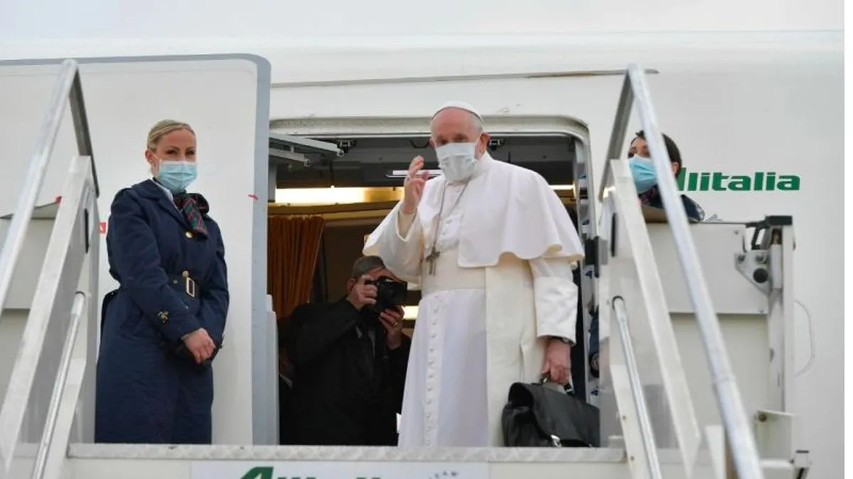 Francisco ya está en Irak. Pocos minutos antes de las doce del mediodía (14 horas en Bagdad), el vuelo papal aterrizaba en la capital del país. A los pies de la escalerilla, le esperaban las autoridades religiosas (el Nuncio sigue de cuarentena), así como el primer ministro del país, y dos niños que le hicieron entrega de unas flores. Bajo un viento de impresión, que volteaba una y otra vez las faldas de la casulla papal y le obligaron a guardar el solideo.