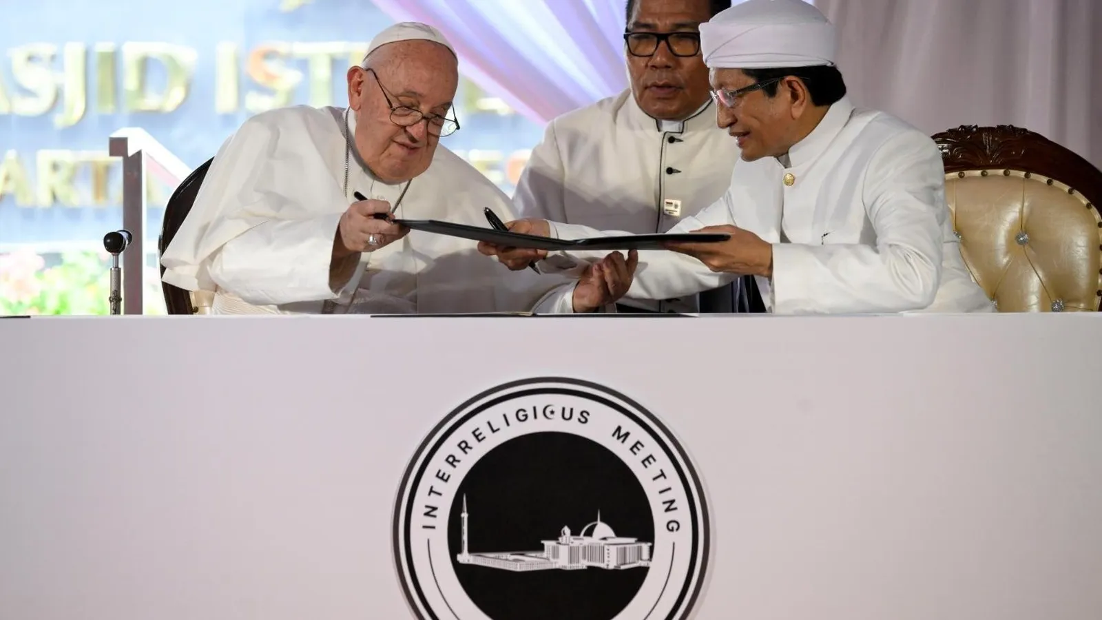 La firma se produjo durante el encuentro interreligioso celebrado en un espacio externo de la mezquita de Istiqlal, la más grande del sureste asiático, y en el que participaron lideres de las religiones presentes en el país como el islam, el protestantismo, el catolicismo, el hinduismo, el budismo y el confucianismo.