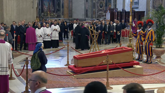 Poco después de que esta mañana se abriesen las puertas de la basílica de San Pedro para acoger los restos mortales del papa Francisco y dar paso a las 72 horas de velatorio público previo al funeral de este próximo sábado, 26 de abril, una riada de cardenales, obispos y eclesiásticos comenzaron al desfilar ante el sencillo féretro de madera.