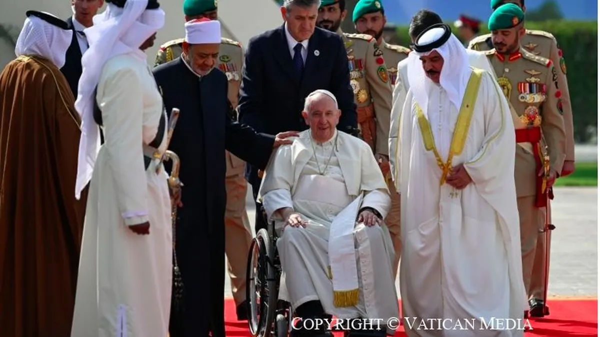 Arrancó el Papa destacando cómo Bahrein evoca a "dos mares" y que las aguas del mar "conectan las tierras y ponen en comunicación a las personas, uniendo pueblos distantes". También la Tierra, "desde lo alto" se presenta como un inmenso mar azul. Como Bahrein y sus islas, "somos una única familia; no islas, sino un único y gran archipiélago".