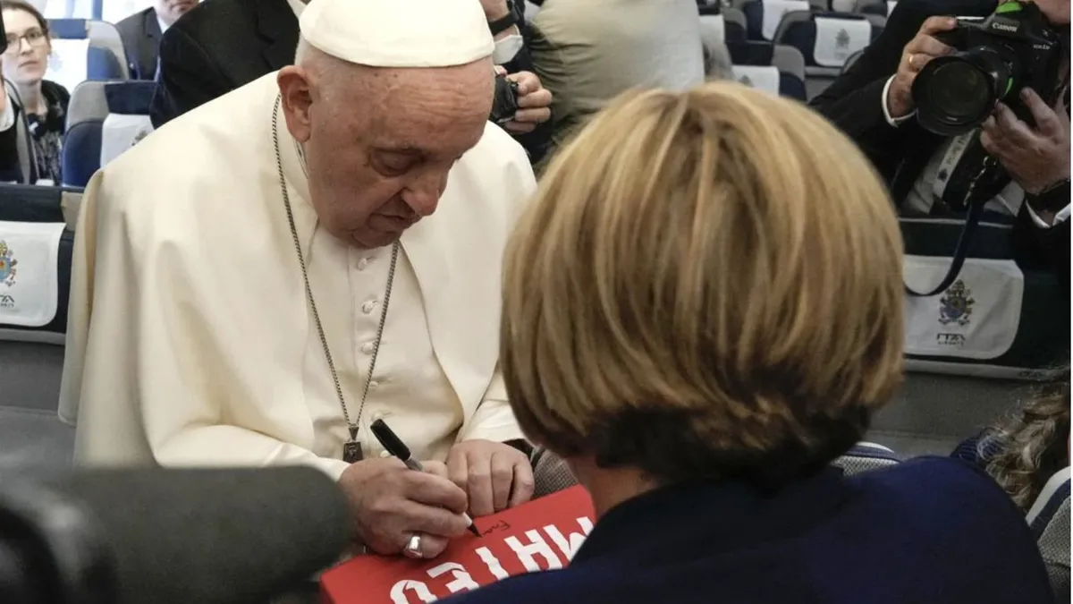 Además, durante el saludo a los casi 80 periodistas que le acompañarán en este viaje con etapas en Papúa Nueva Guinea, Timor Oriental y Singapur, Francisco también recibió una pequeña linterna que llevaba uno de los migrantes rescatados hace unos días en el Mediterráneo central por el barco Ocean Viking de la ONG SOS Mediterranee.
