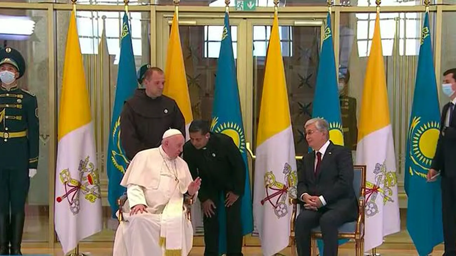 El Papa descendió en una plataforma móvil y fue llevado en silla de ruedas hasta la sala VIP del aeropuerto, donde tuvo lugar la ceremonia de bienvenida, con bailes regionales y banderas de los dos estados. Tras esto, el Papa se traslada en coche al Palacio Presidencial de Ak Orda para los actos de bienvenida oficiales, que tendrán lugar en el palacio de Ak Orda, con una reunión privada entre el pontífice y el presidente de la República. Posteriormente, Francisco pronunciará el primero de sus seis discursos en el país.