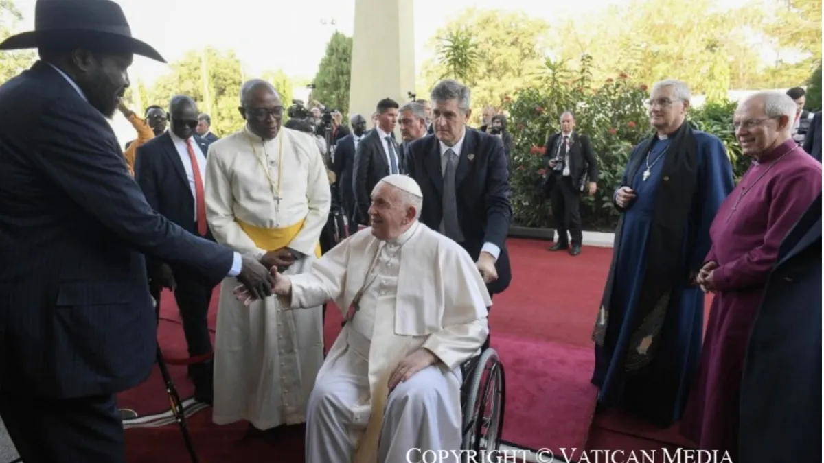 "Me alegra estar en esta tierra que llevo en el corazón". El Papa Francisco está visiblemente emocionado. Si está cansado por los tres días de viaje en Congo y el vuelo hasta Yuba, no lo aparente. Su alegría al encontrarse con sus dos amigos, Justin Welby, e Iain Greenshields, se multiplicó al comprobar cómo las alegrías, los gritos y los cantos volvieron a ser una constante en su camino común hasta el Palacio Presidencial, donde les aguardaba el presidente Salva Kiir Mayardit. También, unas fortísimas medidas de seguridad, pues la paz y la violencia conviven en un frágil equlibrio en el país más joven de la Tierra.