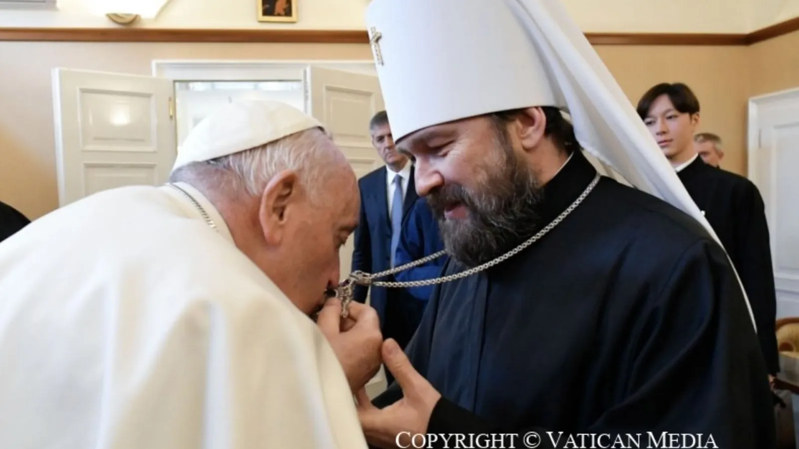 El portavoz vaticano Matteo Bruni había informado en la Sala de Prensa de la Santa Sede sobre tal posibilidad añadiendo que no figuraba en el programa. Francisco saludó al Metropolita con un abrazo y besó su encolpion. Como en tantas audiencias anteriores, ya que éste, en recuerdo del encuentro, obsequió esta vez a Francisco con cuatro volúmenes de su monografía en seis volúmenes Jesucristo. Vida y enseñanza, traducido al italiano.