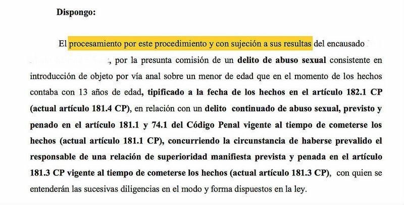 En el auto, el juez Emilio Lamo de Espinosa dictamina "el procesamiento por este procedimiento y con sujeción a sus resultas del encausado(...), por la presunta comisión de un delito de abuso sexual consistente en introducción de objeto por vía anal sobre un menor de edad que en el momento de los hechos contaba con 13 años de edad, tipificado a la fecha de los hechos en el artículo 182.1 CP (actual artículo 181.4 CP), en relación con un delito continuado de abuso sexual, previsto y penado en el artículo 181.1 y 74.1 del Código Penal vigente al tiempo de cometerse los hechos (actual artículo 181.1 CP), concurriendo la circunstancia de haberse prevalido el responsable de una relación de superioridad manifiesta prevista y penada en el artículo 181.3 CP vigente al tiempo de cometerse los hechos (actual artículo 181.3 CP)".