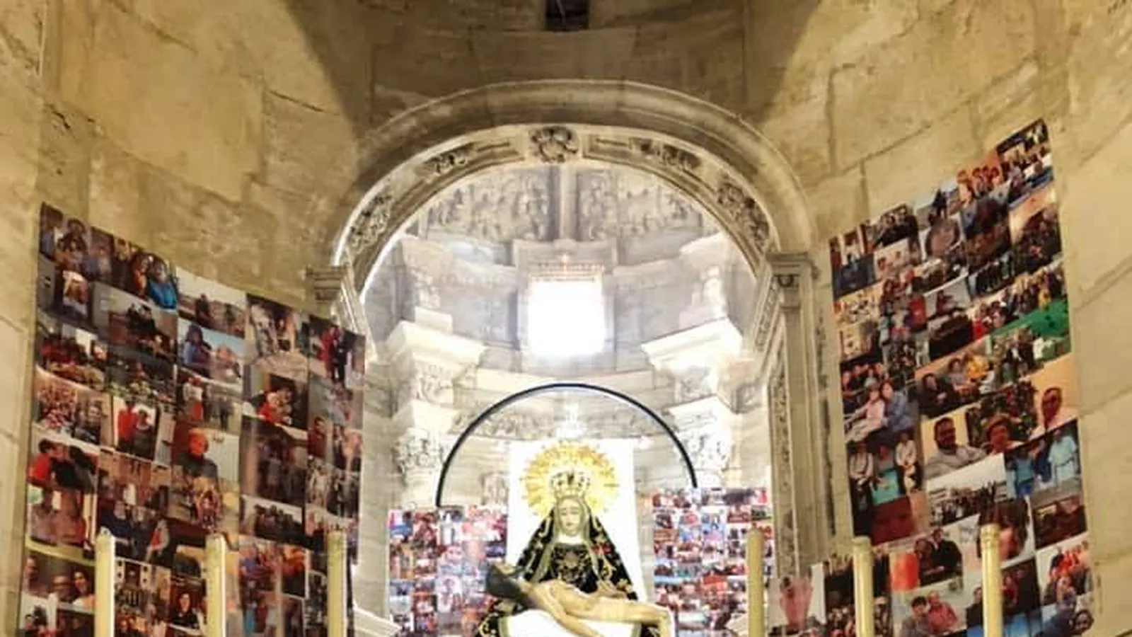 El ingenio del párroco ha permitido celebrar a la patrona, la Virgen de las Angustias, que ha lucido en el altar junto a las imágenes de más de medio millar de fieles enviadas por redes sociales y por guasap al sacerdote