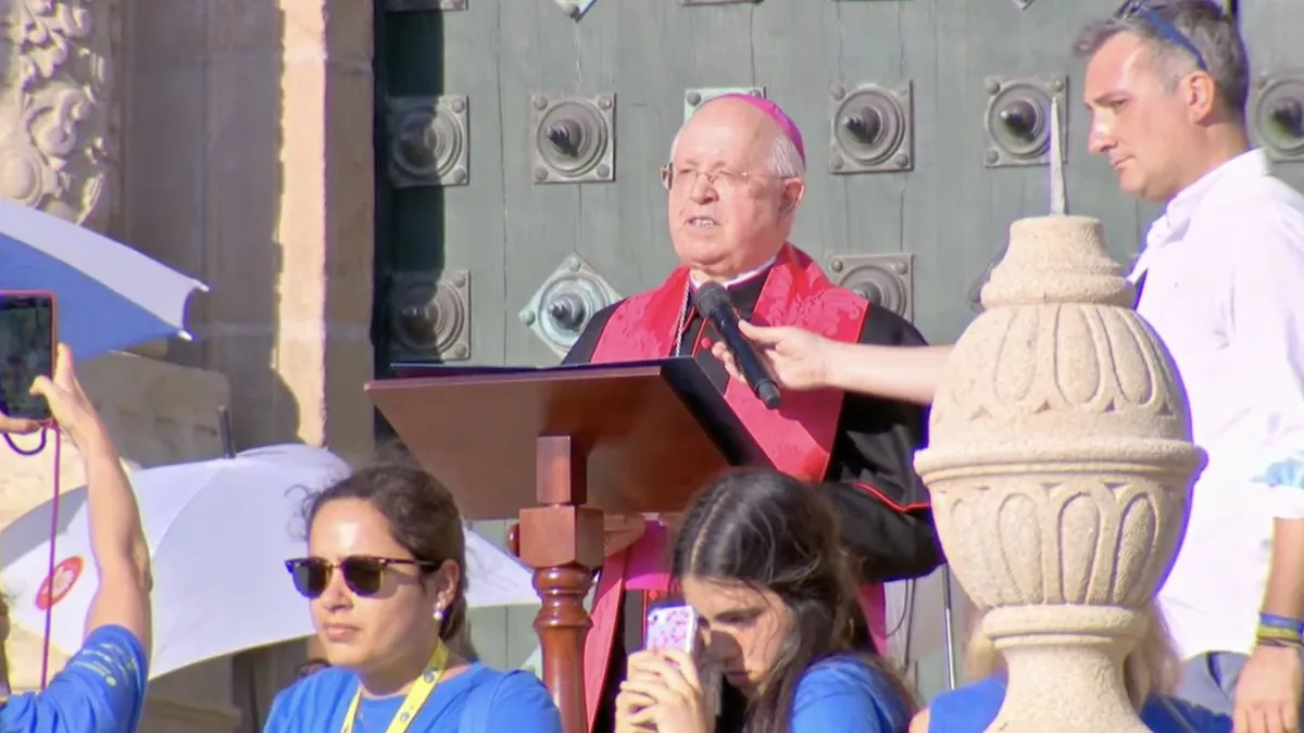 “Habéis llegado con el deseo de encontraros de la mano del Apóstol Santiago con Cristo, Camino, Verdad y Vida. Él es el verdadero manantial que mantiene vivos vuestros proyectos y vuestros ideales”, les dijo en su saludo el obispo de Santiago, tras una espera que se les hizo larga por el sol y el retraso por cambiar a última hora el lugar de la alocución, finalmente desde las escalinatas de la catedral.