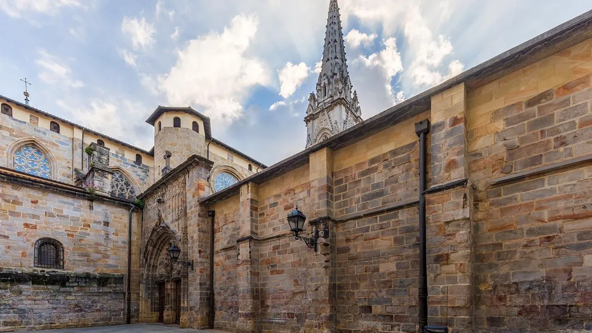 El edificio, de la antes parroquia y hoy catedral basílica de Bilbao, es anterior en sus dos versiones —una en 1300 y otra en 1374— al templo actual, este de estilo gótico, el mayor de los existentes en Vizcaya, pese a sus medidas relacionadas con las del resto de las catedrales de Espala. Tiene 51 metros de largo, por 22 de ancho y de alto, y su torre, la tercera de la que se tiene referencia, rebasa los 64, construida con sillares blancos procedentes del Monte Oíz, nido litúrgico y vecinal de once campanas. Una de las puertas, la antigua del Ángel, es conocida como la de los Peregrinos. Las veneras y las conchas que la decoran, proclaman a la perfección. En otra puerta de acceso campea el escudo de armas de la Villa, como símbolo de posesión y patronato, con presencia de las esculturas de un obispo y de un rey, que bien pudieran corresponderse con las de don Gonzalo, al frente entonces de la poderosa mitra de Calahorra y con las del rey Juan de Castilla.