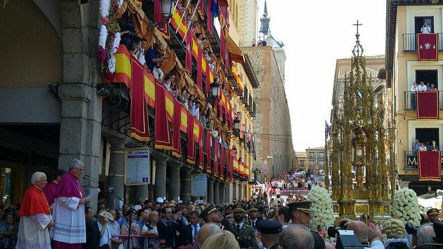 Tras su alocución, ha sido el cardenal Antonio Cañizares, quien fuera arzobispo de Toledo y que ahora es prelado en Valencia, el que ha procedido a la bendición eucarística, momentos antes de que la procesión retomara su marcha pata volver a la Catedral Primada.