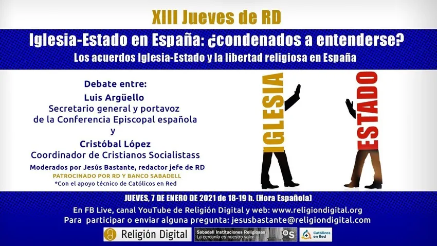 En esta ocasión, con un tema de notable actualidad: 'Iglesia-Estado en España: ¿condenados a entenderse?'. Y con dos primeros espadas. Este jueves, 7 de enero de 18 a 19h (horario de Madrid), el secretario general y portavoz de la Conferencia Episcopal, Luis Argüello, y el coordinador federal de la corriente Cristianos Socialistas, Cristóbal López, debatirán, cara a cara, sobre las relaciones entre la Iglesia y el Gobierno en nuestro país. Como siempre, con el apoyo del Banco Sabadell y el soporte técnico de Católicos en Red.