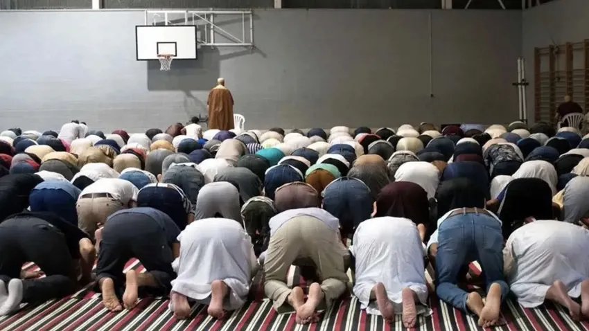 Musulmanes celebran la fiesta del sacrificio del cordero en una cancha de baloncesto