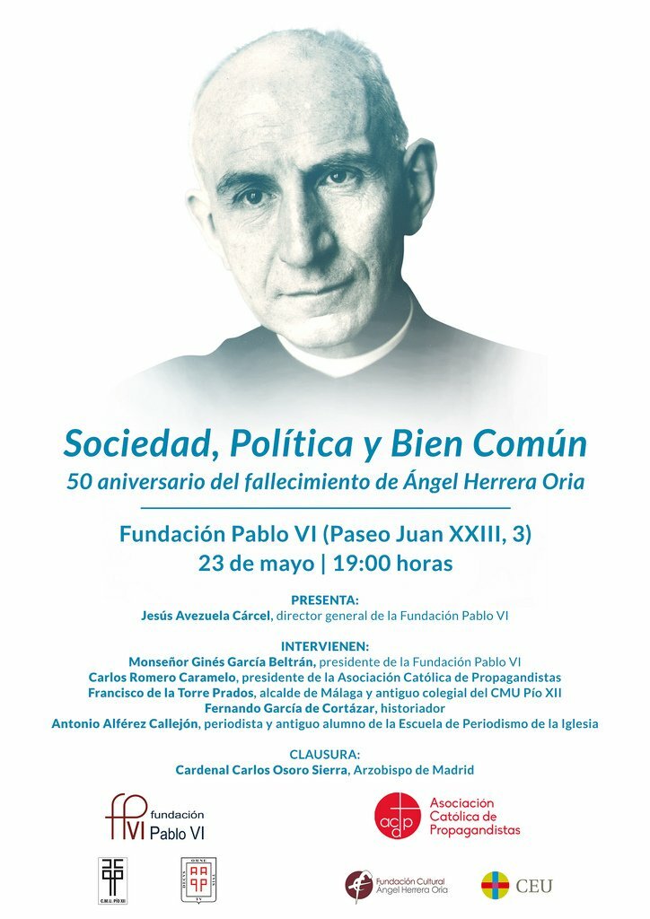 Como punto de partida de este año dedicado a Ángel Herrera, el próximo 23 de mayo, a las 19 horas, tendrá lugar el acto conmemorativo de apertura, en la sede de la Fundación, Paseo Juan XXIII, 3. Organizado conjuntamente con la Asociación Católica de Propagandistas, el homenaje, que presentará el director de la Fundación Pablo VI, D. Jesús Avezuela, contará con la presencia de su Presidente, Mons. Ginés García Beltrán, obispo de Getafe; el presidente de la ACdP, D. Carlos Romero Caramelo; D. Francisco de la Torre Prados, alcalde de Málaga y antiguo colegial del CMU Pio XII; el historiador D. Fernando García de Cortázar; y el periodista D. Antonio Alférez, alumno de la Escuela de Periodismo de la Iglesia fundada por Ángel Herrera. La clausura correrá a cargo del Cardenal Carlos Osoro, Arzobispo de Madrid.