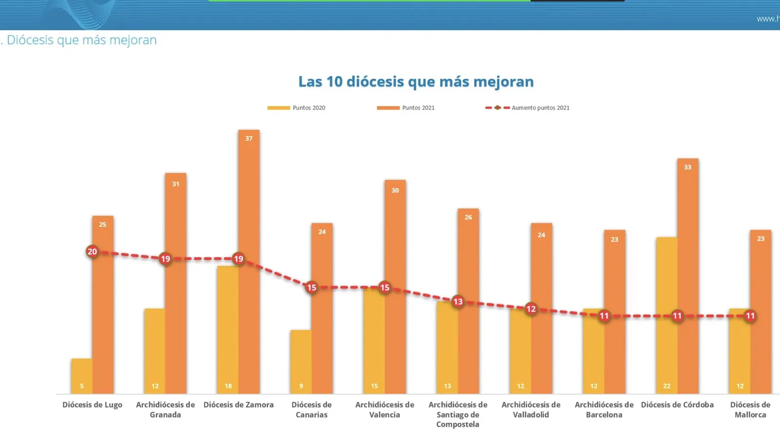 Las diócesis que más han mejorado en este tercer informe -que se basa en un sistema de puntuación sobre 21 aspectos, con una posibilidad de puntuación máxima de 42 puntos-son las de Lugo, Granada, Zamora, Canarias, Valencia, Santiago de Compostela, Valladolid, Barcelona, Córdoba y Mallorca.