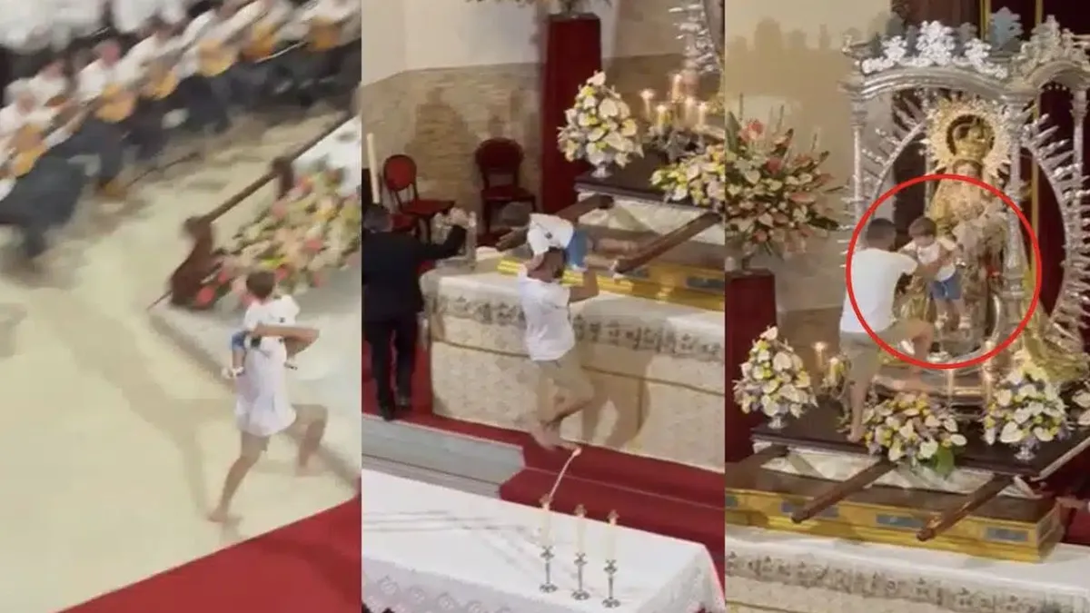 Irrumpe a toda velocidad en una iglesia con un niño a hombros, lo deja con la Virgen y se va