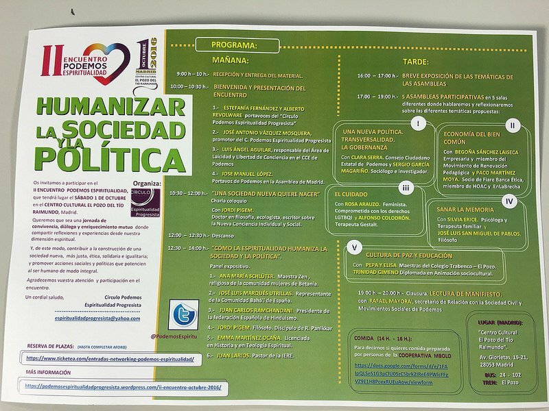 "Humanizar la sociedad y la política" II Encuentro de Podemos Espiritualidad. El 1 de octubre, desde las 10:00 de la mañana en el Centro Cultural del Pozo del Tío Raimundo.Rosa, José Antonio, un placer. Ya nos contaréis qué tal y qué conclusiones sacamos de esto.