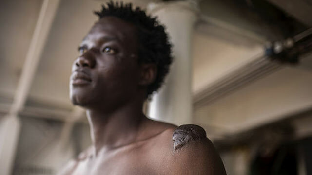 Dos grandes cicatrices inflamadas le recuerdan los golpes diarios de las milicias que lo mantenían en cautiverio. El dolor más profundo, detalla, no venía de las armas con las que dejaban en carne viva su hombro y su cabeza. El mayor sufrimiento procedía de la voz que le obligaban a escuchar cada día al otro lado del teléfono: "Mi madre lloraba pero no tenía dinero. No podía hacer nada pero oía mis gritos. Me forzaban a llamarla", relata Tagnabou Elvis a bordo del Open Arms.
