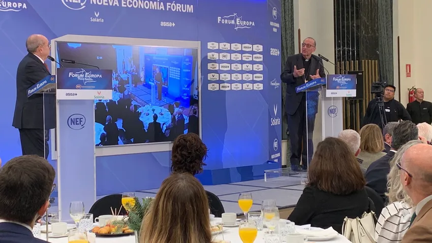 Sin más compañía episcopal que la del portavoz, César García Magán, pero flanqueado a la derecha por el Defensor del Pueblo, Ángel Gabilondo, el presidente de la Conferencia Episcopal española, Juan José Omella, acudió al que probablemente será su último desayuno del Nueva Economía Fórum como líder de la Iglesia española. La respuesta de la Iglesia ante los abusos, el 'informe Cremades', la reunión con el Papa, el futuro de las vocaciones, pero también la amnistía, la polarización ideológica y la crispación social fueron algunos de los ejes del encuentro con el purpurado, brillantemente presentado por el director general de la Fundación Pablo VI, Jesús Avezuela.
