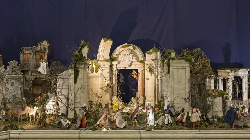 En este belén las casas son las típicas del barrio de los españoles de Nápoles, los vendedores tienen en sus puestos burrata o salami y la comitiva de los Reyes Magos llega a un misterio donde sus protagonistas están bajo una réplica del zaguán del Palacio Real
