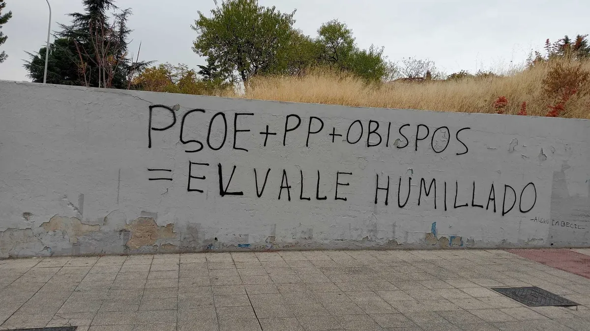 'PSOE+PP+Obispos= el Valle humillado'. Las pintadas de los grupos ultracatólicos en la sede de la Conferencia Episcopal vuelven a verse, seis meses después. Los autores no son víctimas de abusos en la Iglesia, ni laicistas redomados, ni defensores de la dimisión de Zornoza (que, por cierto, llegará como obispo residencial a la reunión de mañana), sino, oh, sorpresa, ultracatólicos nostálgicos del Franquismo que vuelven a la carga contra la supuesta 'traición' de los obispos españoles sobre la resignificación del Valle de Cuelgamuros.