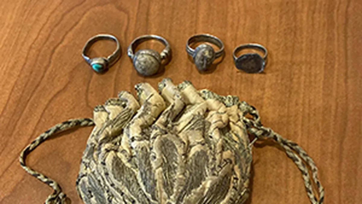 Una bolsa de tela y cuatro anillos