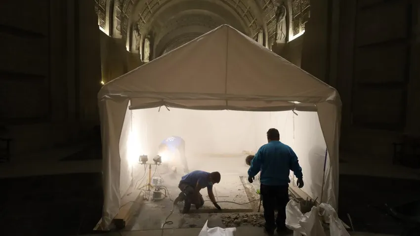 Desde las 5,30 de la mañana, y a lo largo de cinco horas, funcionarios de Patrimonio trabajaron para retirar la enorme losa que ya no puede verse junto al altar de la basílica de Cuelgamuros, y para reponer otra losa, del mismo tamaño pero sin inscripción alguna. El acto se ha retrasado al encontrarse bloques de hormigón y de ladrillo, no esperados, al retirar la losa.