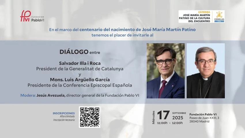 En tiempos de polarización política (y religiosa), de insultos, blancos y negros, es más necesaria que nunca la cultura del encuentro. Y actos como el que acogerá la Fundación Pablo VI el próximo 17 de septiembre, a las 11 horas, son una buena apuesta por el diálogo y la conversación. Se encuentran dos católicos: uno laico, político, socialista, presidente de la Generalitat por más señas. El otro, obispo, arzobispo en realidad, y presidente... de la Conferencia Episcopal Española. Salvador Illa y Luis Argüello, frente a frente. Moderados por Jesús Avezuela.