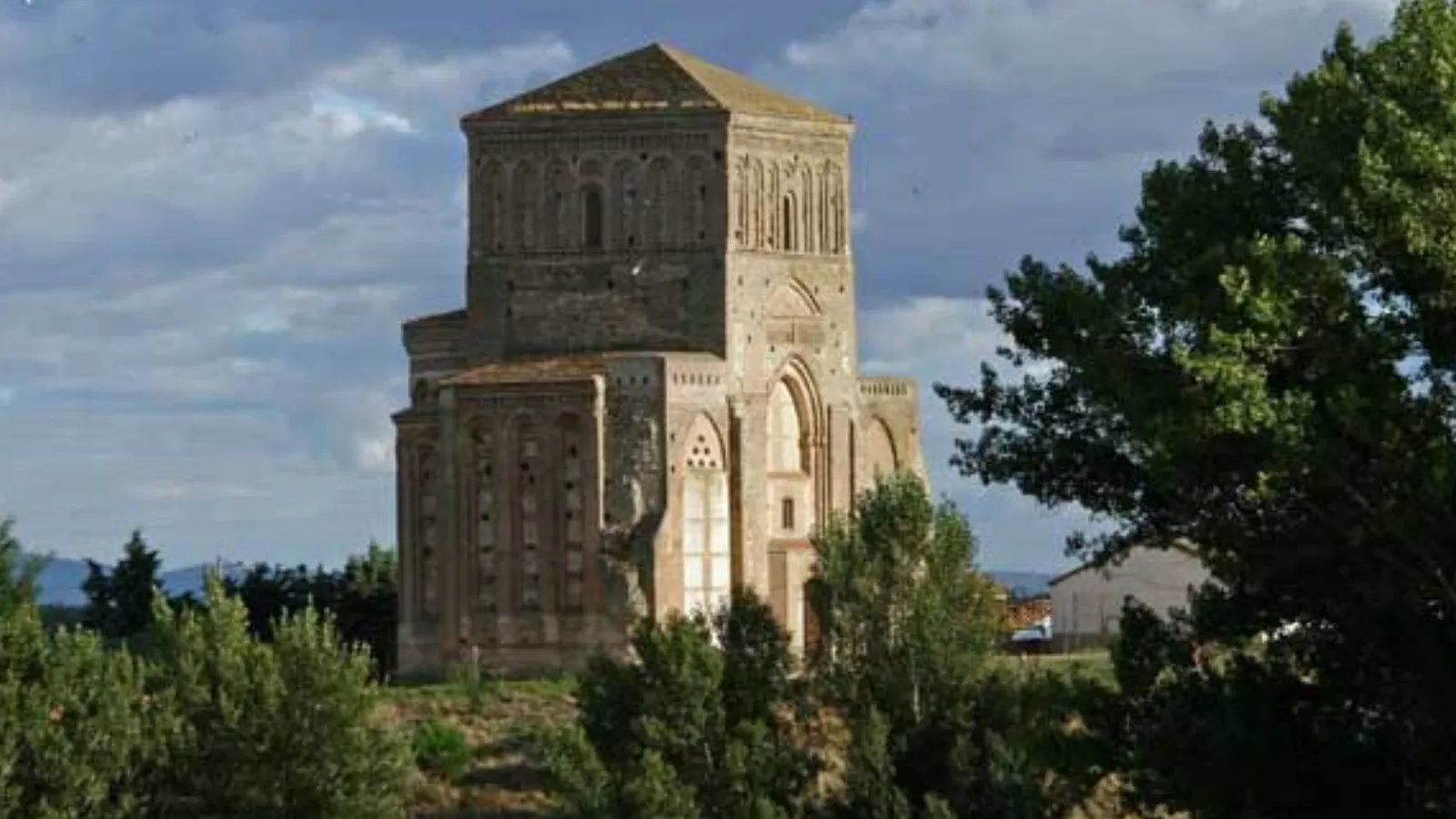 Cuenta con un ábside triple decorado con una serie de arcos y sobre el crucero se encuentra un cimborrio montado en el interior a base de una cúpula sobre pechinas, decorado en la parte exterior por una serie de siete arcos de ladrillo en cada fachada.