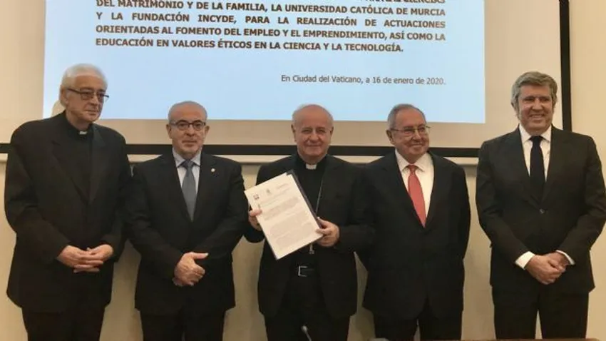 Los presidentes de la Pontificia Academia para la Vida y el Pontificio Instituto Teológico Juan Pablo II para las Ciencias del Matrimonio y la Familia han rubricado hoy viernes un acuerdo en Roma con José Luis Mendoza, presidente de la Universidad Católica de Murcia, y el presidente y el director general de la Fundación Incyde