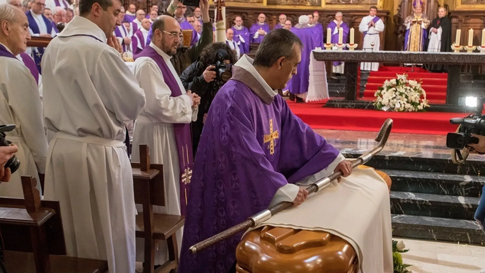 Después de la oración y las lecturas de despedida por dos de sus sobrinos, el obispo se ha acercado hasta el féretro acompañado por el diácono, los acólitos y el maestro de ceremonias de la Catedral para asperjar con agua bendita e incensar los restos mortales como corresponde a las exequias cristianas en las que se da el último adiós al cuerpo del difunto. Tras ello, y una vez que se ha procedido a la inhumación del féretro en el hueco provisto a los pies del altar.