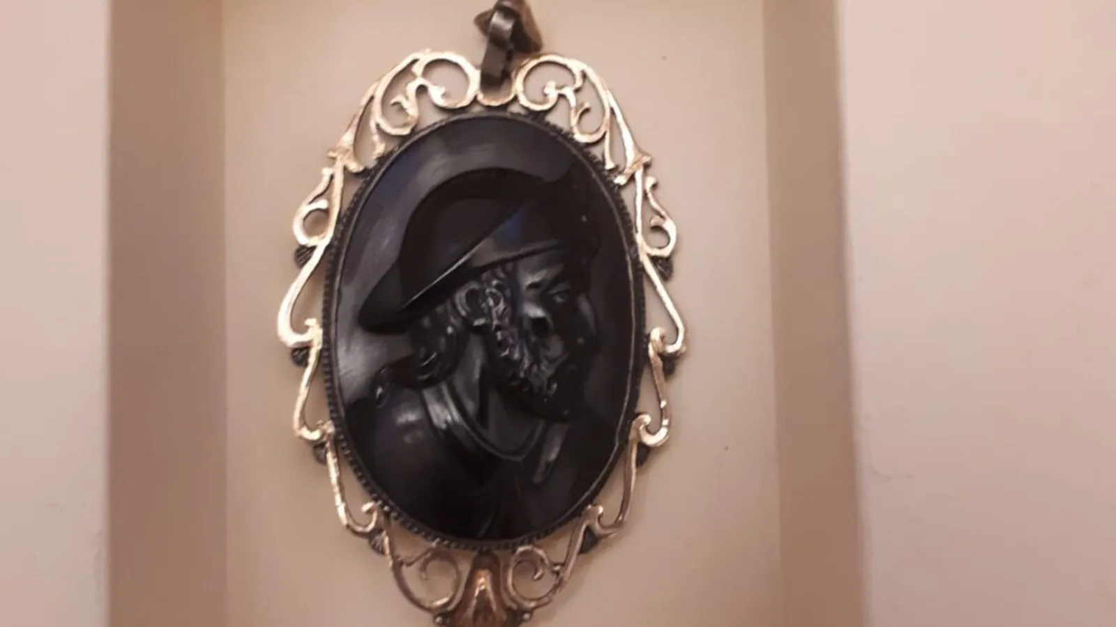 El medallón, de procedencia desconocida, es un buen ejemplo de la tradicional artesania en piedra azabache que se convirtió, junto con las labores en plata, la de mayor éxito entre los peregrinos a Compostela en los siglos dorados de la ruta jacobea, desde sus inicios, hasta el siglo XVII, principalmente.
