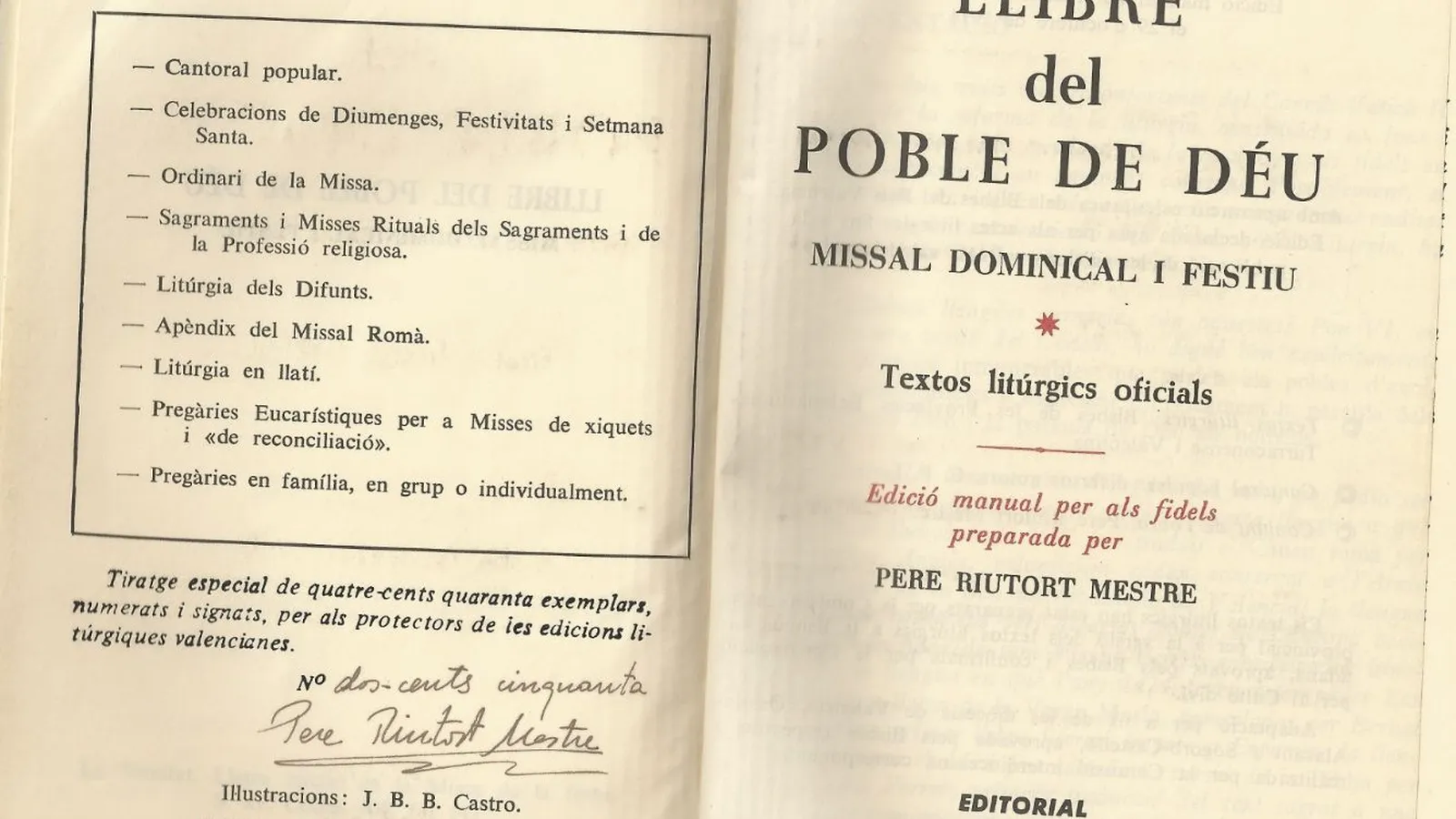 Fue el 9 de octubre de 1974 (como lo recoge la página 6 del Llibre del Poble de Déu), que los obispos del País Valenciano presentaban este Misal Dominical y Festivo, preparado por el P. Riutort y editado por Gorg. El arzobispo de València, José Mª García Lahiguera y sus obispos auxiliares, José Gea y Jesús Pla, con el obispo de Oriola-Alacant, Pablo Barrachina y el de Sogorb-Castelló, Josep Mª Cases (el único que realmente se creía lo que firmaba), mostraban su deseo, en esta presentación del Llibre del Poble de Déu, para que la implantación de la liturgia en lengua vernácula en la Iglesia valenciana (que aún estamos esperando), trajese “frutos de mayor unidad, de mayor comprensión y vivencia de la Palabra de Dios”. Por eso en este texto, los obispos valencianos decían que les gustaba “presentar hoy a los fieles valencianos, esta edición del Misal Dominical y Festivo, que esperamos que sea instrumento de provechosos bienes espirituales”.
