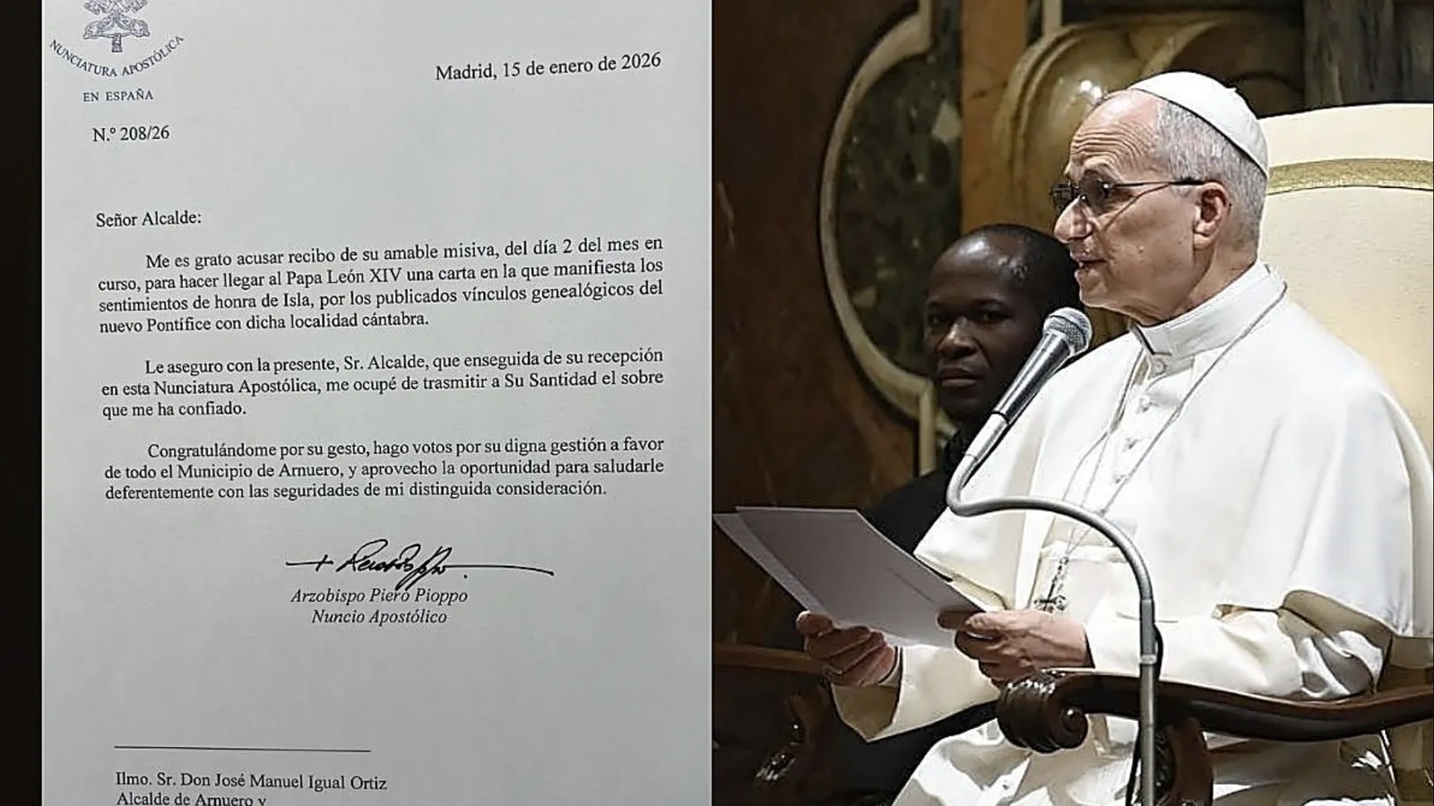 Así, el pasado 15 de enero Pioppo comunicó al regidor que había recibido su "amable" misiva para hacer llegar al Papa sus "sentimientos de honra de Isla, por los publicados vínculos genealógicos de nuevo Pontífice con dicha localidad cántabra".