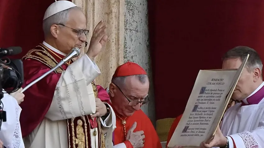 Parolin escucha a León XIV dando la bendición Urbi et Orbi
