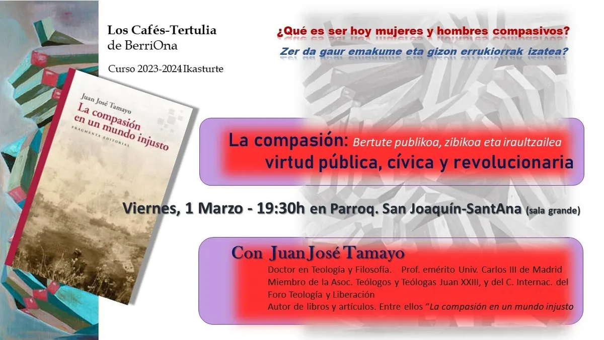 Juan José Tamayo estará este próximo viernes, 1 de marzo en Vitoria-Gasteiz, invitado por el centro pastoral BerriOna. Donde hablará de “La compasión: virtud pública, cívica y revolucionaria”. Esta charla se encuadra dentro del programa anual “Café-Tertulia” que dicho centro lleva a cabo. Y que este año tiene por título general “¿Qué es ser hoy mujeres y hombres compasivos?”