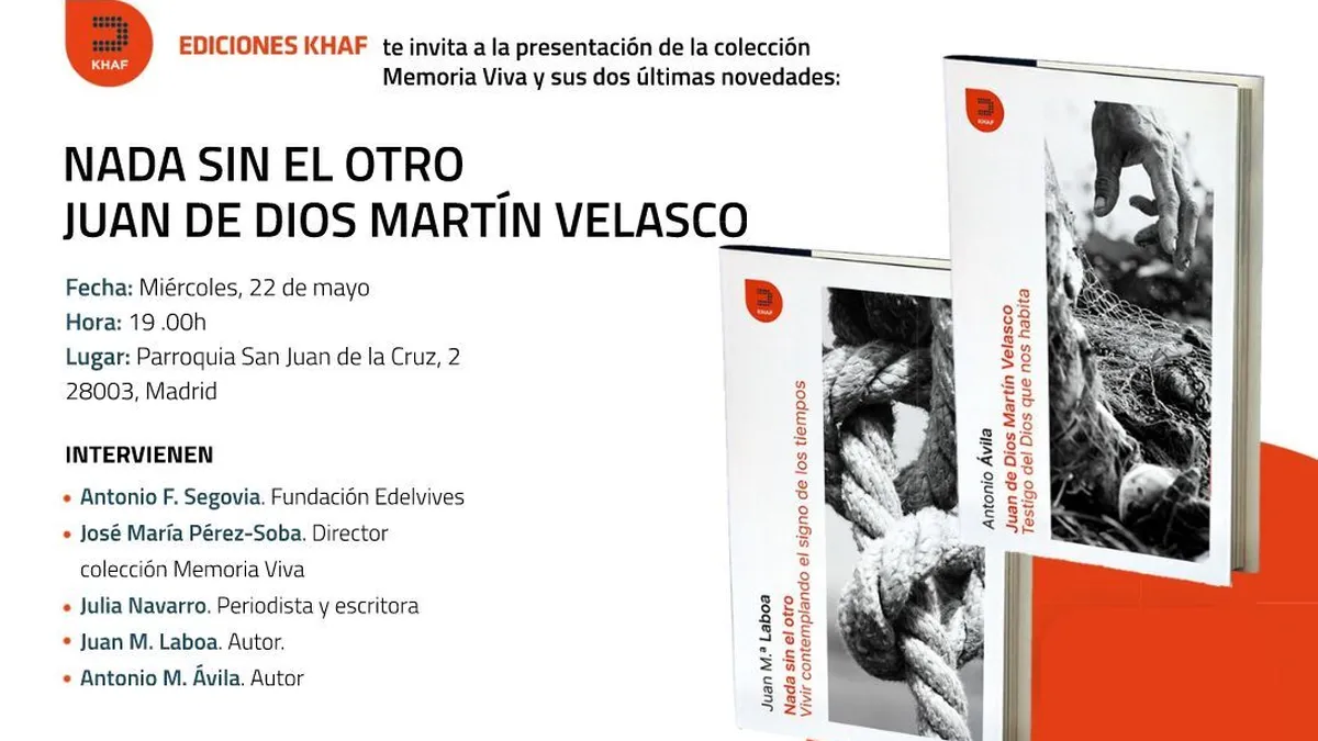 Ediciones Khaf presenta el próximo miércoles, 22 de mayo en una de las salas de la Parroquia de san Juan de la cruz (Plaza san Juan de la Cruz, 2 de Madrid) los dos últimos títulos de la colección Memoria Viva dedicados a Juan María Laboa y Juan de Dios Martín Velasco
