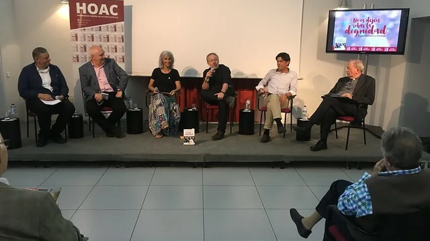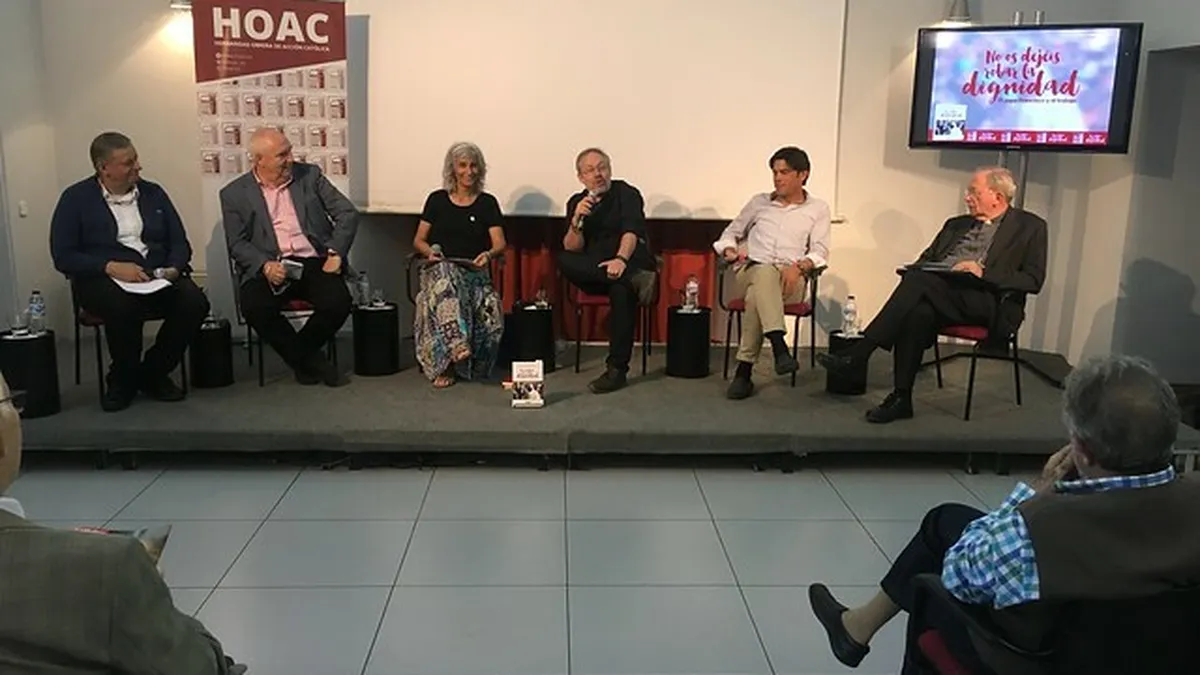 Obispos, sindicatos, trabajadores se unieron en defensa del magisterio del trabajo de Francisco. En el acto intervinieron, además del autor, el obispo emérito de Ciudad Real e histórico responsable de la Pastoral Obrera de la CEE, Antonio Algora; el vicario para el Desarrollo Humano Integral y la Innovación de la diócesis de Madrid, José Luis Segovia (el cardenal Osoro finalmente excusó su presencia); el secretario de Participación Institucional de CC. OO., Paco Carbonero; y el secretario general de USO, Joaquín Pérez; moderados por la responsable de Difusión de la HOAC, Teresa García.