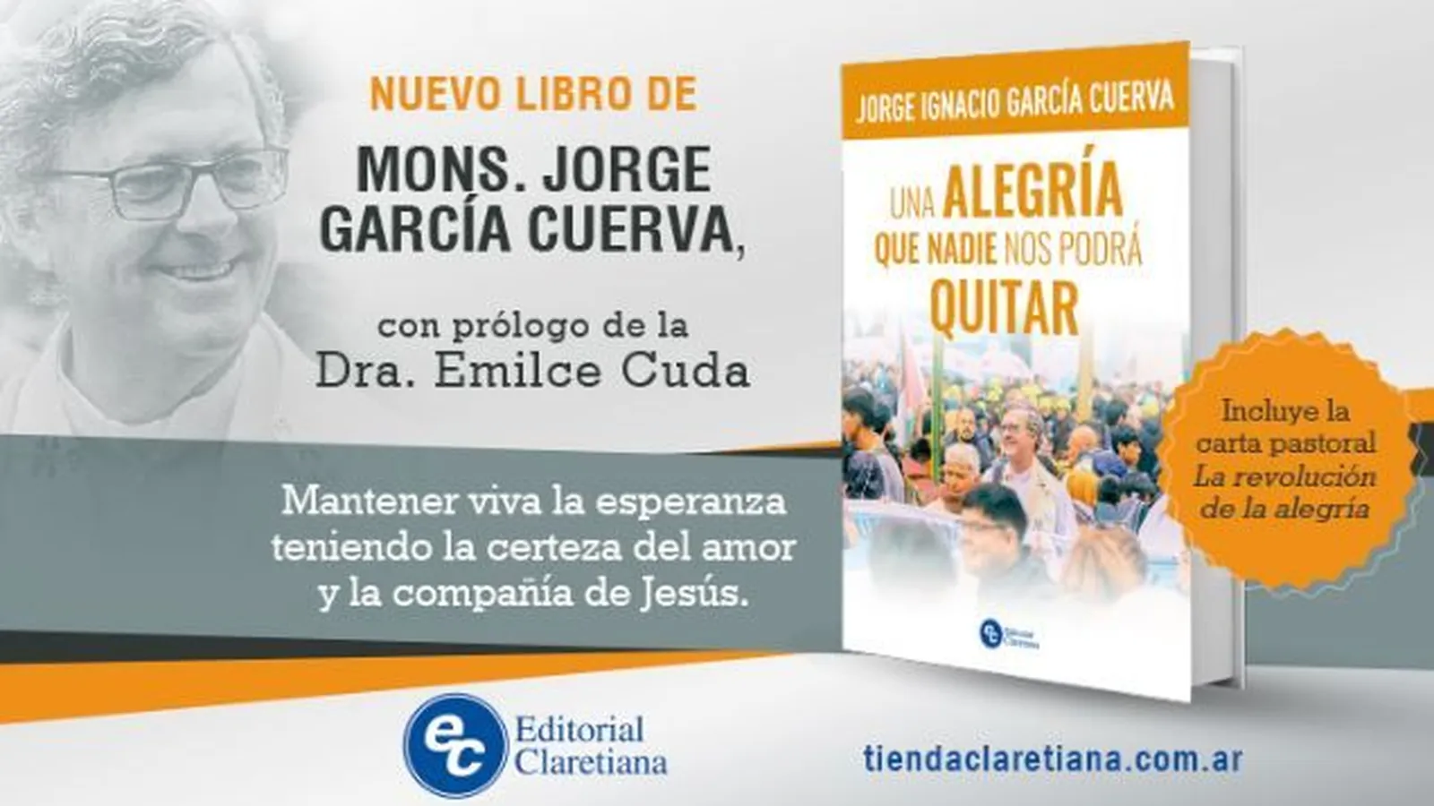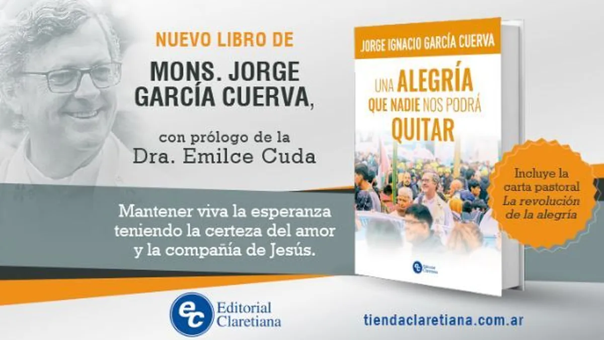 Editorial Claretiana invita a la presentación del nuevo libro del arzobispo de Buenos Aires, monseñor Jorge García Cuerva "Una alegría que nadie nos podrá quitar". La obra se presentará el viernes 27 de septiembre a las 18 en la parroquia porteña San Nicolás de Bari, ubicada en Av. Santa Fe 1352. Una vez finalizada la presentación, se realizará la firma de ejemplares.