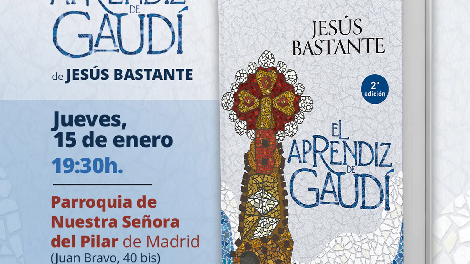En el inicio del Año Gaudí, el periodista y escritor Jesús Bastante presenta en Madrid su novela El aprendiz de Gaudí, una historia de amor ambientada en los primeros años de la construcción de la Sagrada Familia de la que La Esfera ha publicado dos ediciones, el próximo jueves, 15 de enero, a las 19.30 horas, en la Parroquia de Nuestra Señora del Pilar de Madrid (Juan Bravo, 40 bis), junto al curartista y párroco de El Pilar Toño Casado y la teóloga Pepa Torres.