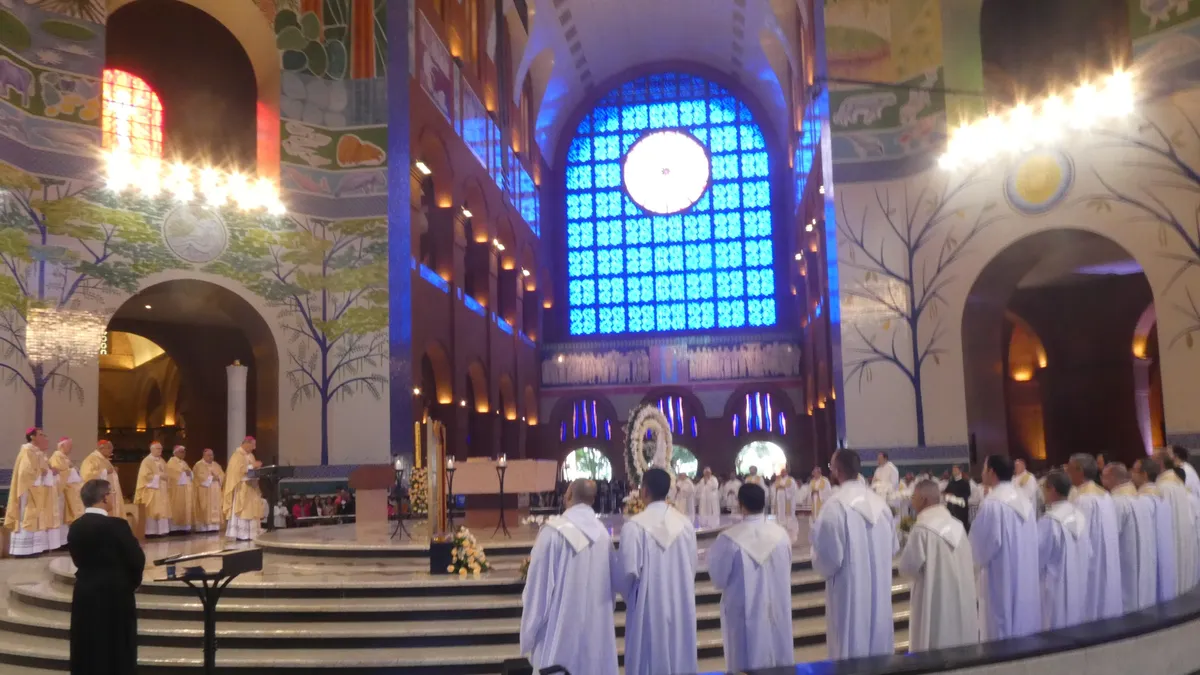 La misa, presidida por el presidente de la CNBB, Mons. Walmor Oliveira de Azevedo, y concelebrada por el presidente del Celam, Mons. Miguel Cabrejos, su vicepresidente, el cardenal Odilo Scherer, el cardenal Orani Tempesta, obispos, y más de 500 sacerdotes, que participan en el 18º Encuentro Nacional, contó con una destacada participación de peregrinos que vinieron a visitar a su Madre, Nuestra Señora de Aparecida.