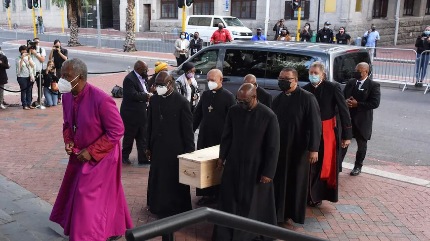 Entre un fuerte dispositivo de seguridad, el féretro llegó a la catedral de San Jorge a primera hora de la mañana y fue recibido por el actual arzobispo de Ciudad del Cabo y líder de la Iglesia anglicana del sur de África, Thabo Makgoba, y otros sacerdotes.